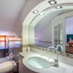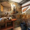 Tra queste due stanze è presente un primo bagno, nel quale è possibile notare la minuziosa attenzione ai dettagli: caratterizzato da pareti in marmo scuro e lavabo in pietra, offre box doccia e