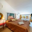 le pareti abbellite da quadri in stile etnico, dove i colori vivaci spiccano contro il blu del mare visibile dalle grandi finestre.